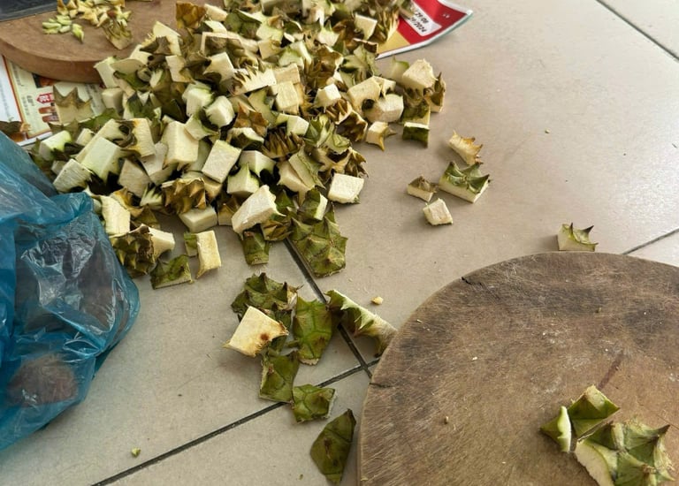 Các nguồn nguyên liệu gồm: vỏ sầu riêng, lá chuối.